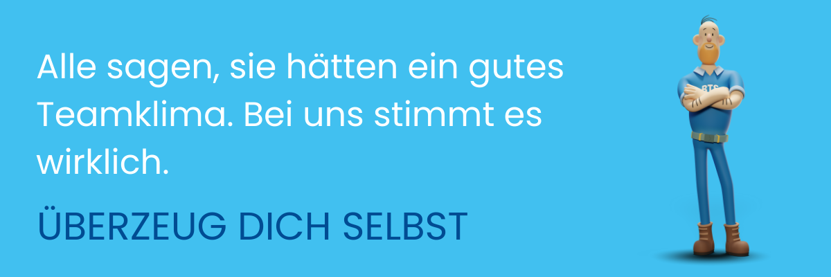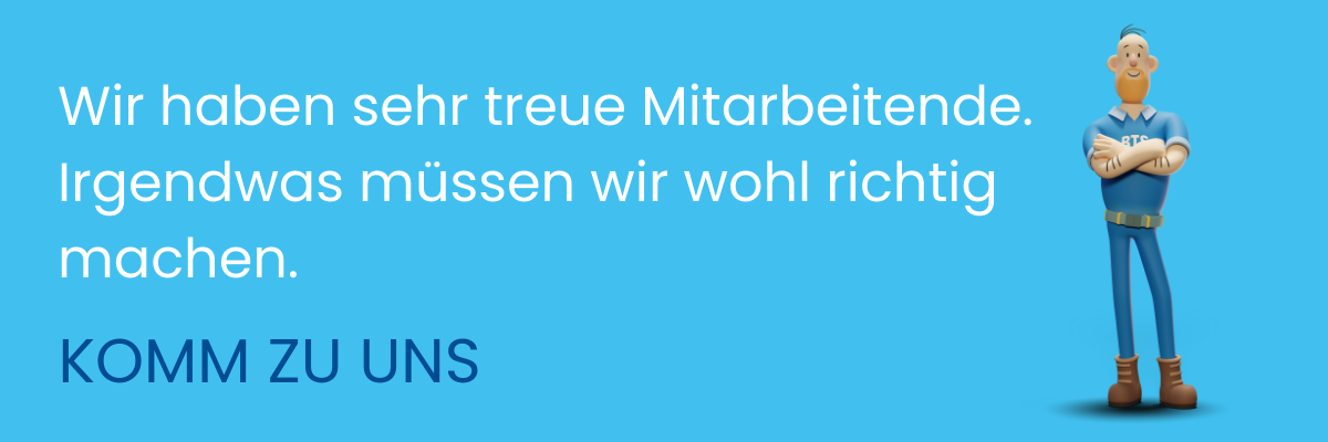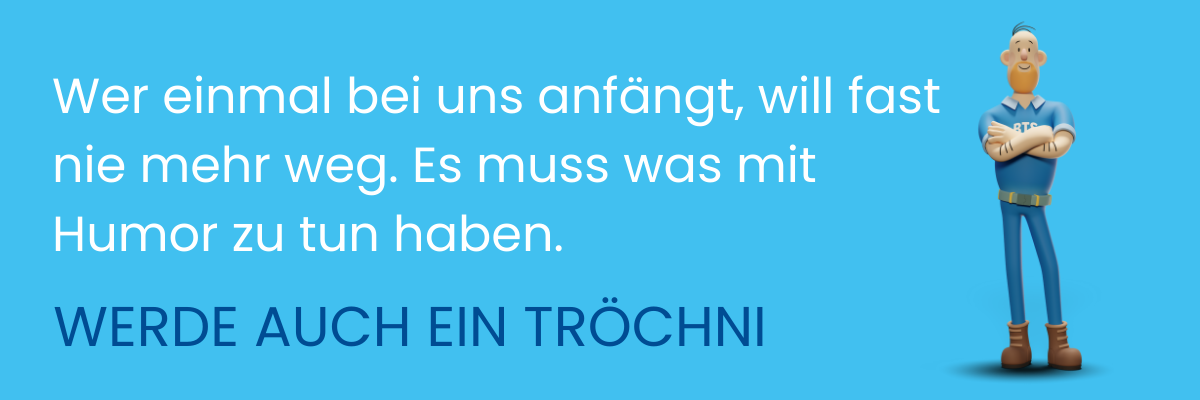 Klingt alles gut und recht – jetzt willst du wissen, ob es auch wahr ist? Super! Stell uns auf die Probe und sende Lebenslauf und Zeugnisse an Sue Sommer auf s.sommer@bts-service.ch oder schick ihr eine Sprachnachricht oder ein Video auf 079 585 73 78. Lass uns wissen, was du alles kannst und warum du zu unserem Team gehören willst.