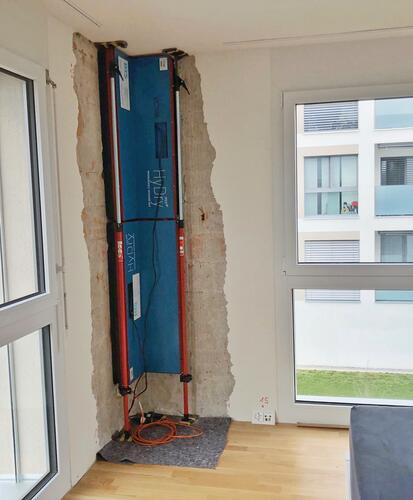 Eine Infrarot-Heizplatte gibt die Wärme pulsierend ab. Das spart Ihnen einige Kilowatt. Hinter der Platte ist eine Bürste als Distanzhalter angebracht, sodass die Feuchtigkeit nach aussen fliehen kann. Lüften Sie deshalb fleissig, um sie abzutransportieren. Sobald die Wand trocken ist, schaltet die Leuchtdiode der Heizplatte auf Grün.